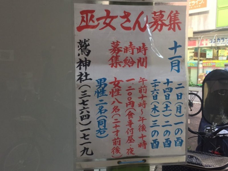 神社や近隣が出る商店街には既に開催告知の張り紙もされており、同時に巫女の募集も行われていた。
