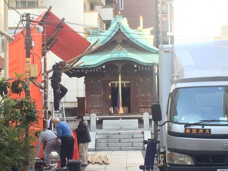 たまたま神社の目の前を通りかかったこの時は、偶然にも設営準備をしていたところを拝見することが出来た。