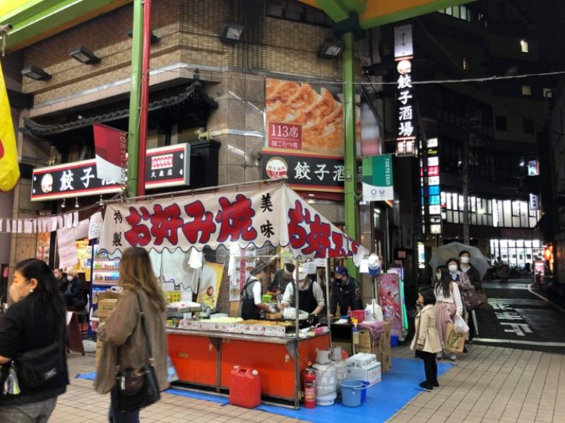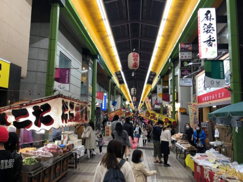 射的やお面屋さん、綿菓子屋さんなどが並び程好く狭まった小道、傘をさす人がすれ違いにくそうに行き来する中を足早に通り抜け、明るく照明がついたアーケード通りに入ると、いつもより少し人通り多め?という感じで賑わっているゾーンに突入。そこそこのディスタンス感。