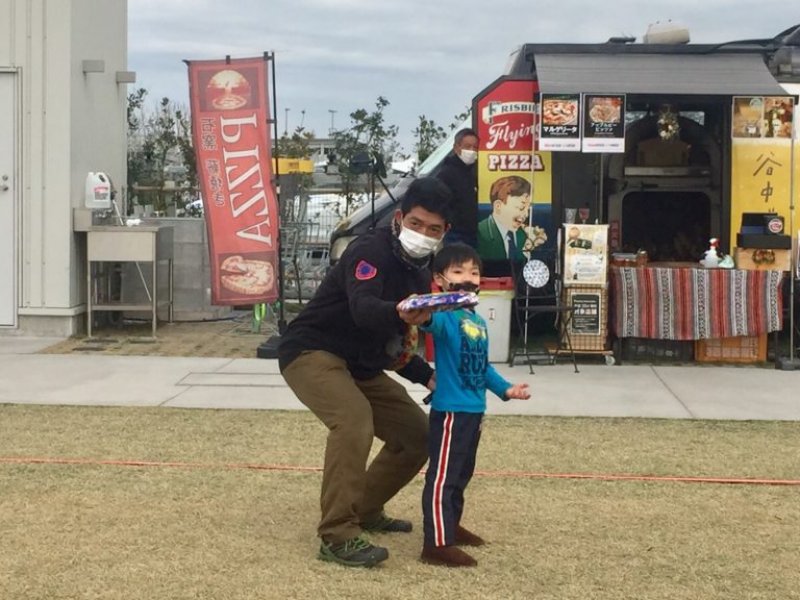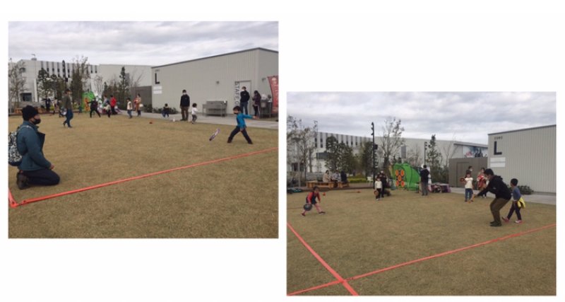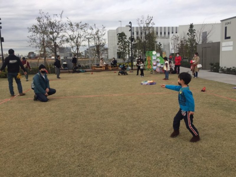 アーティストビレッジという芝生のゾーンでは、このドッヂビーに自由に触れることができ、スタッフのお兄さんが持ち方・投げ方・キャッチの仕方をとても丁寧に教えてくれました。