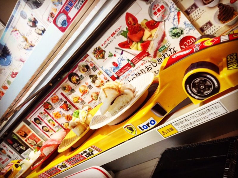 なんだか矛盾しているようにも思えるが、タッチパネルで注文すると、新幹線やF1カー等の乗り物型の容器に乗った寿司を高速でビューン!と届けてけてくれるアトラクション要素たっぷりなお店なのだ。